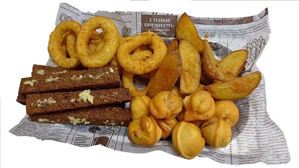 Пельмени во фритюре, гренки бородинские, картофель по-деревенски, луковые кольца
