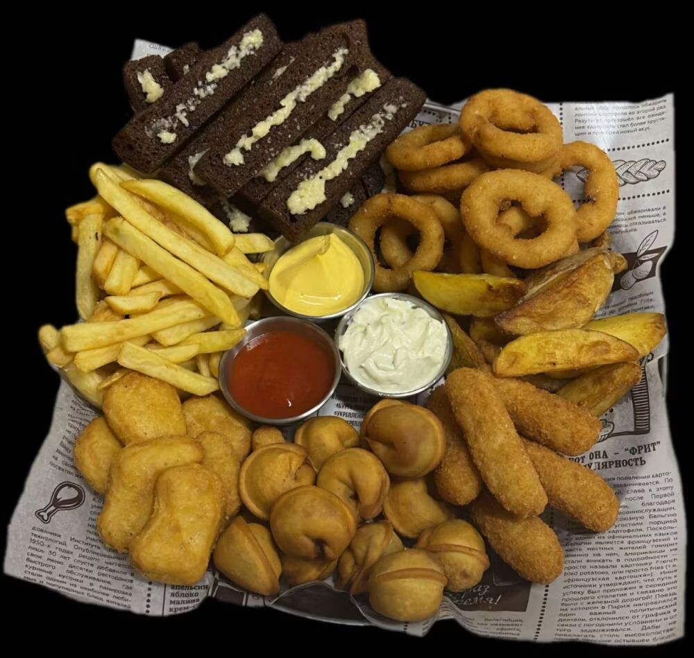 Картофель фри, картофель по деревенски, пельмени, луковые кольца, сырные палочки, наггетсы, гренки, соус сырный. соус острый, соус чесночный.
