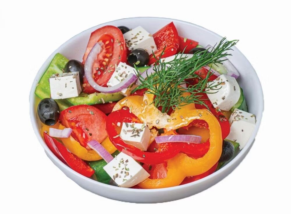Сыр фета, огурцы, помидоры, болгарский перец, лук, маслины