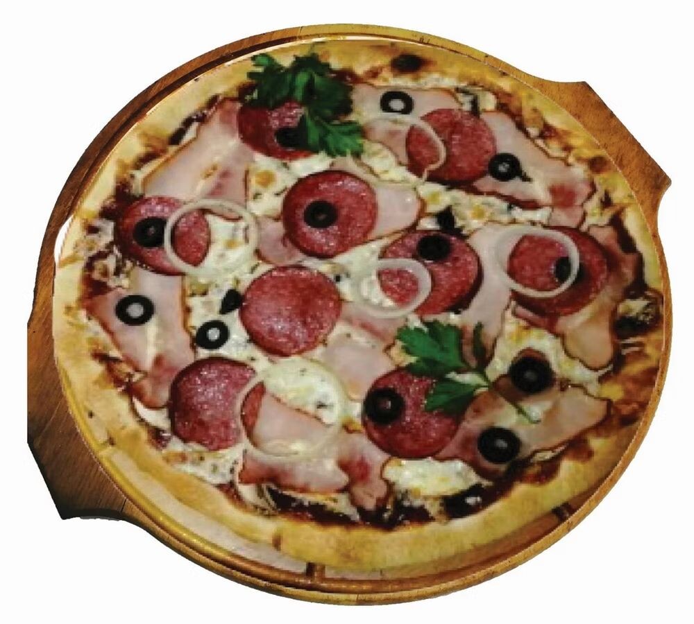 Бекон, сервелат, шампиньоны, сыр моцарелла, лук, маслины, зелень, соус барбекю