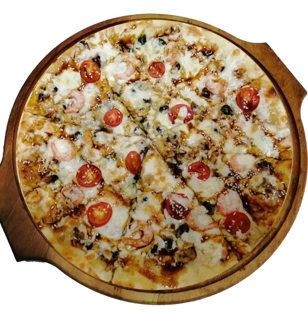 Соус соевый, мидии, сыр моцарелла, креветки, томаты, соус унаги, кунжут