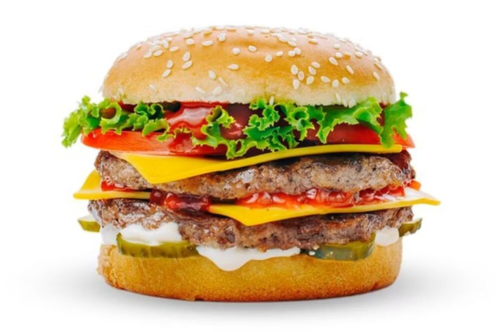 Две котлеты из говядины собственного производства, булочка для бургера, салат айсберг, томаты свежие, огурцы маринованные, соус горчичный, соус томатный, сыр двойной.