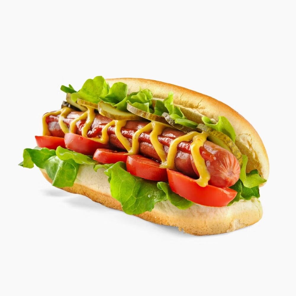 Булочка для хот дога, колбаска говяжья, маринованные огурчики, листья салата, томаты, лук фри, соус томатный, соус горчичный.