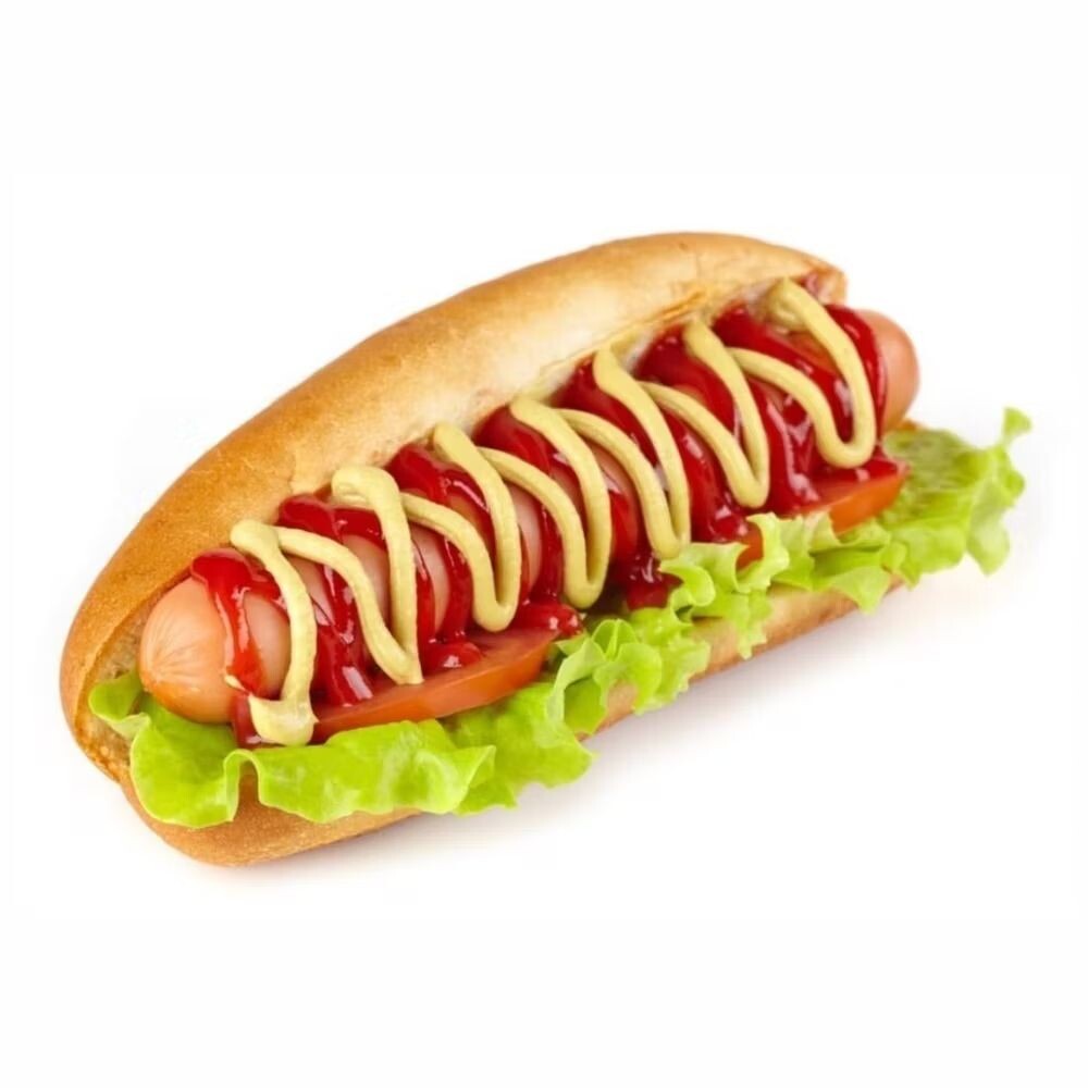Булочка для хот дога, колбаска куриная, маринованные огурчики, листья салата, томаты, лук фри, соус томатный, соус горчичный.