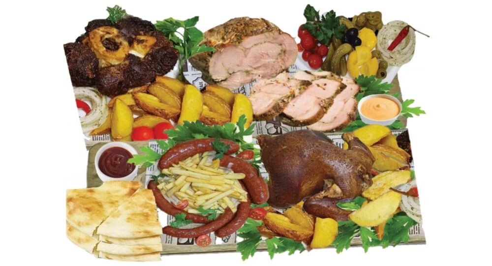 Сочная говяжья рулька, нежная свиная буженина и цыплёнок корнишон гармонично сочетаются с ароматными колбасками — с сыром и охотничьими. Картофель по-деревенски и картофель фри добавляют блюду хрустящую текстуру, а шашлычный и горчичный соусы, маринованный лук, томаты и зелень обогащают вкус. «Супер доска Голодный Папа» — сытное блюдо с разнообразием мясных и овощных вкусов.