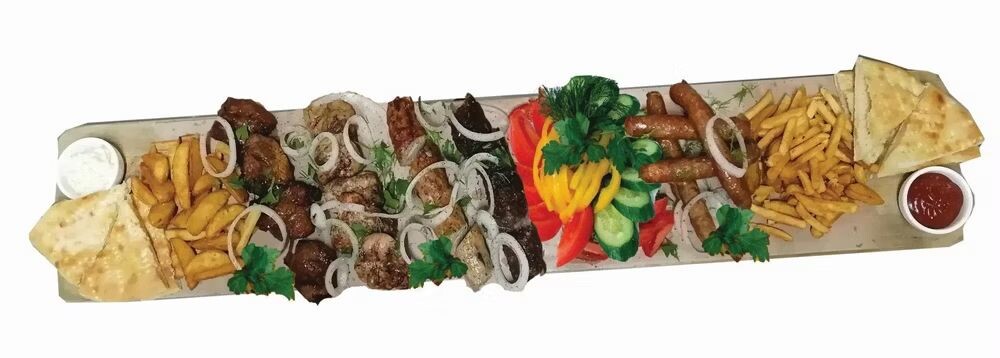 Люля-кебаб из говядины, люля-кебаб из курицы, шашлык из свиной шеи, овощи, куриные крылья, куриные купаты, картофель по-деревенски, картофель фри, фокачча, лук маринованный, шашлычный соус, чесночный соус.