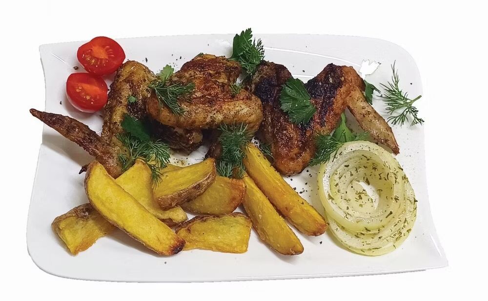 Куриные крылышки жареные на углях, лук маринованный,картофель по деревенски, зелень.