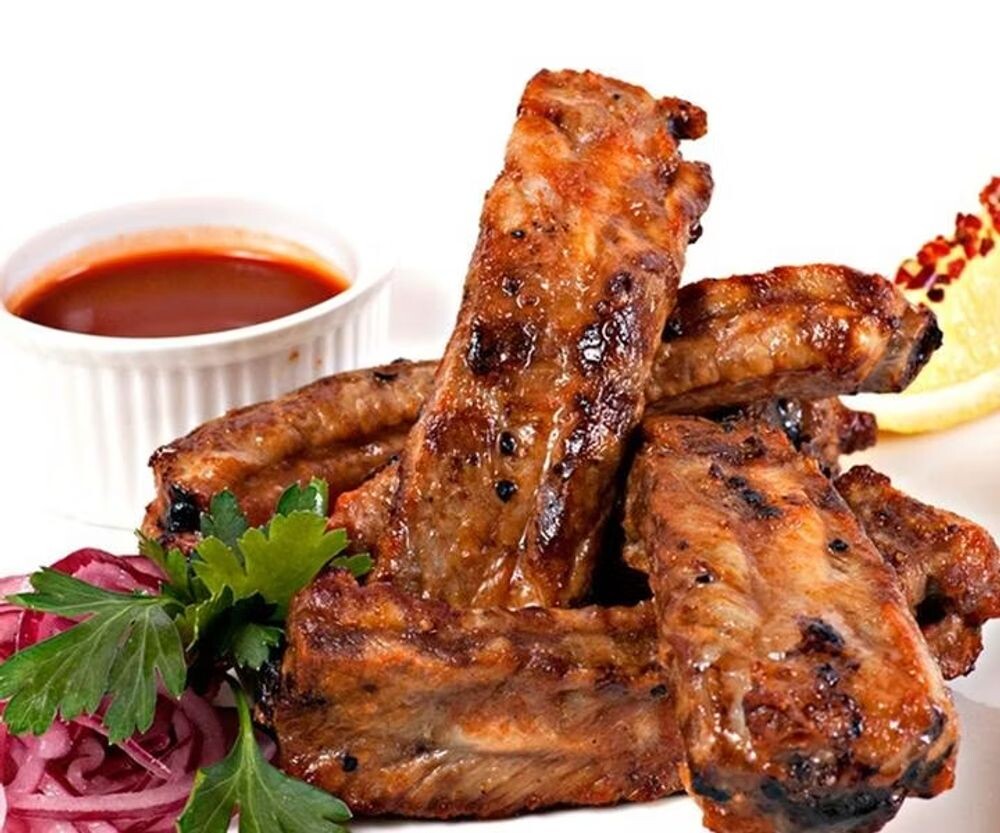 Свиные рёбра, лук маринованный, томаты черри,картофель по деревенски, зелень.