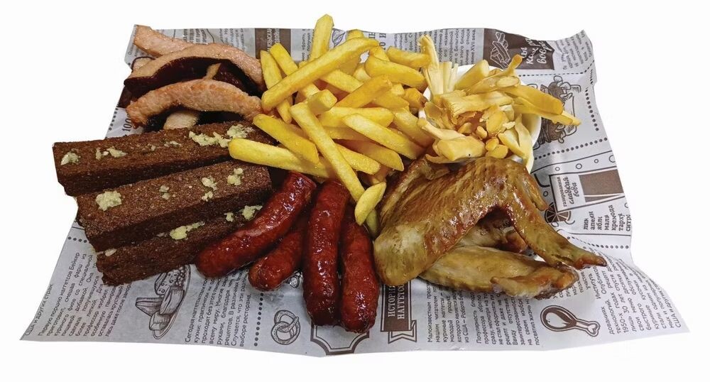 Обжаренный бекон, охотничьи колбаски, копчёные куриные крылья, картофель фри, сыр косичка, гренки.