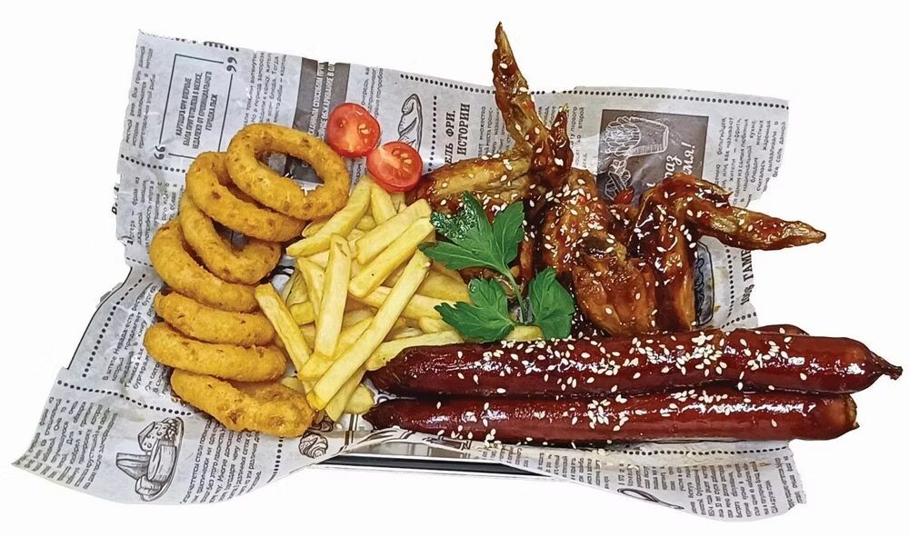 Крылышки куриные острые, колбаски охотничьи острые , картофель фри, луковые кольца острые.