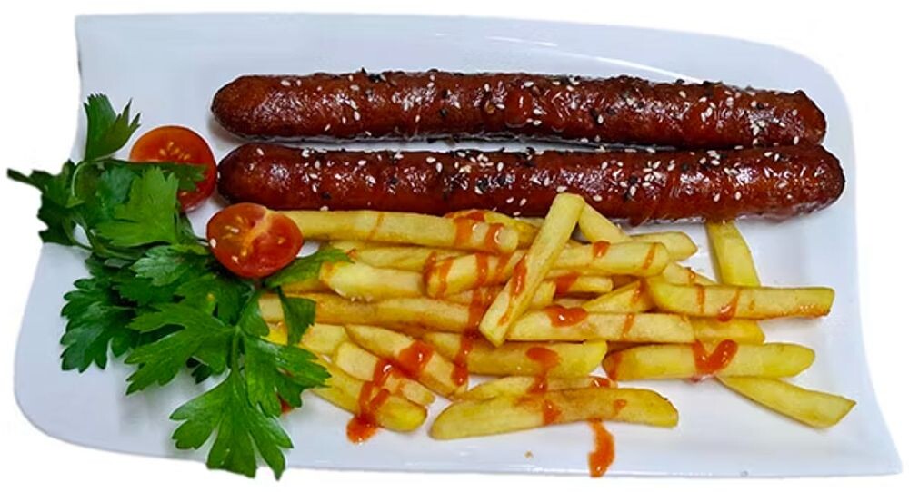 Колбаски Пражские в соусе острый чили с картофелем фри