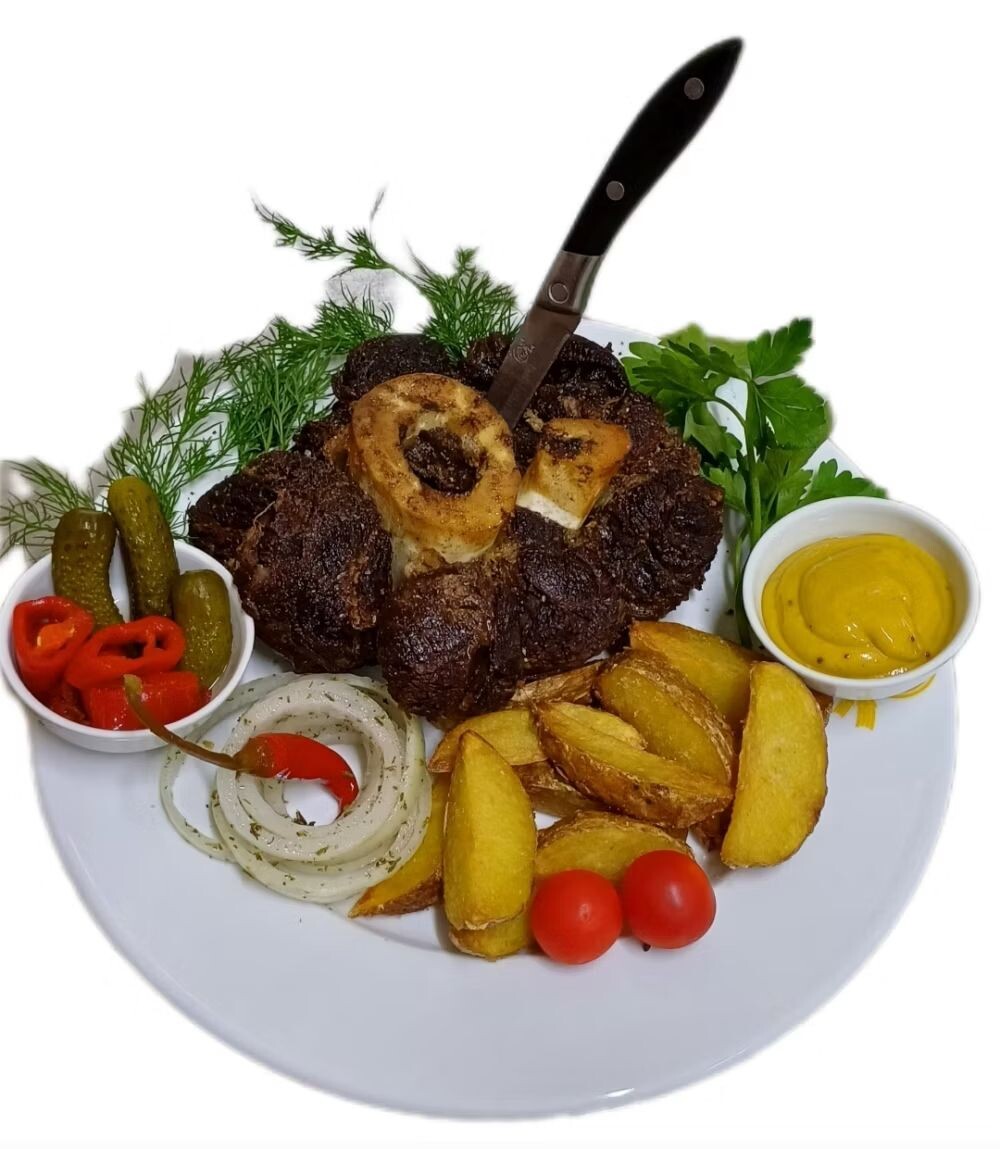 Сочная мягкая говяжья рулька, картофель по деревенски, овощи, зелень, солёные огурчики, томаты, перчик халапньо, лук маринованный, горчица.