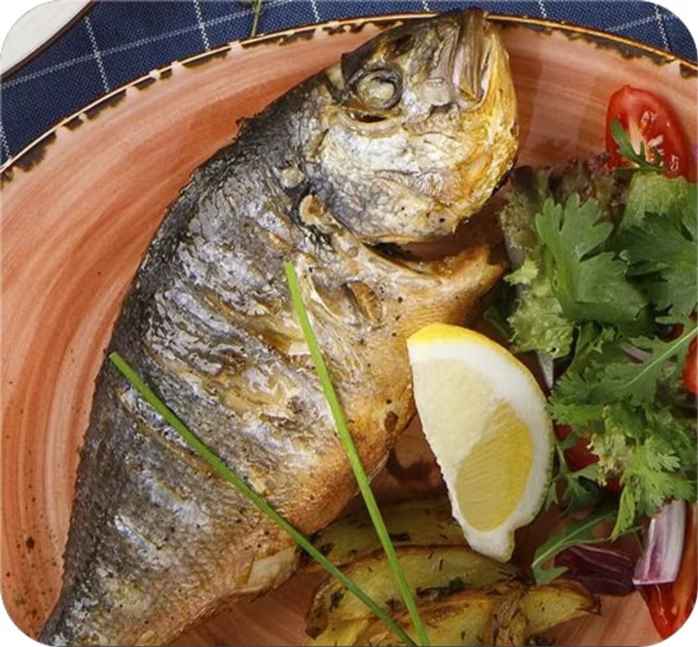 Дорадо, картофель по деревенски, лимон, томаты черри, зелень.
