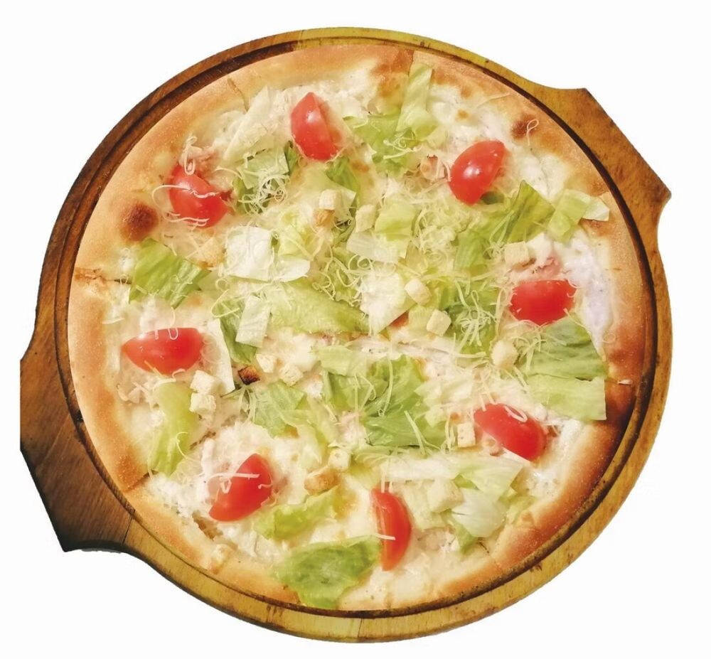 Копчёная курица, сыр моцарелла, сыр пармезан, томаты черри, листья салата, соус цезарь