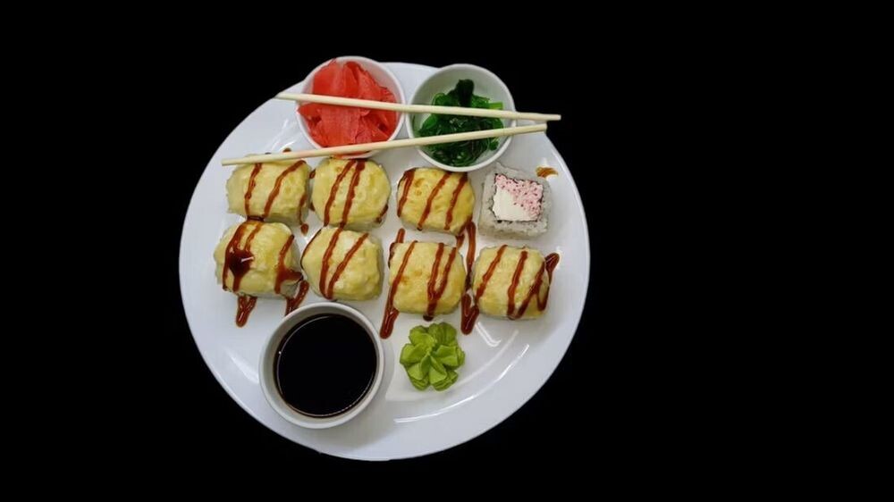 1 соевый соус, имбирь 30гр, васаби 15гр, 1 пара палочек, премиальная упаковка входят в комплект